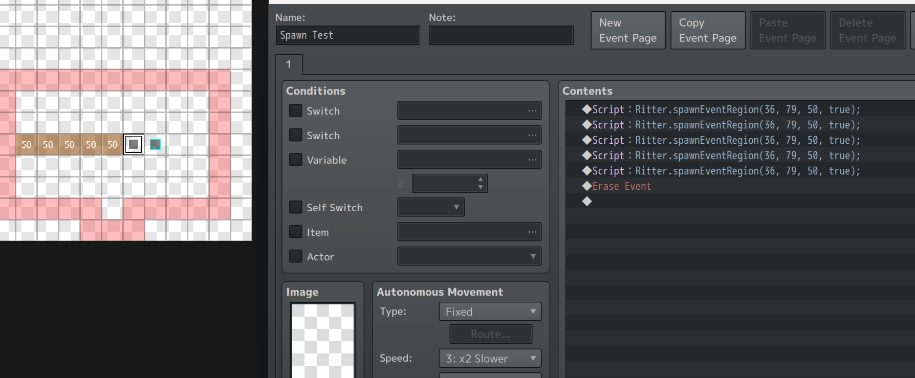 Then I use this script-call to unspawn it: Ritter.unspawnEvent($gameMap._lastSpawnEventId)