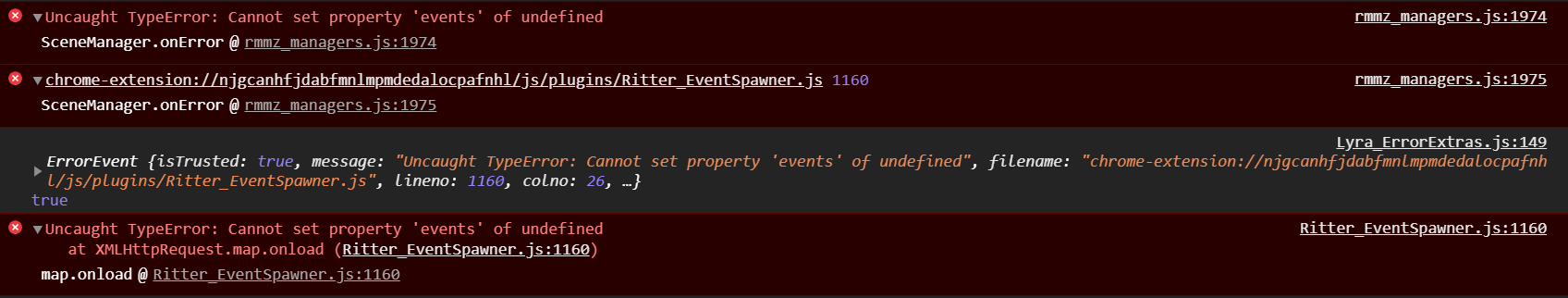 Hello, just got this plugin and was excited to try it out as other event spawning plugins have not worked for me. But this one also doesn't seem to want to work. I'm getting the message "Error Uncaught Error: Failed to load: data/MapNaN.json". I only have 1 map that has the events on it, and I have that map in the Pre Spawn Map setting. Still doesn't load. In order to see that error message I had to comment out lines 953-954 in the code as the console told me there was an "Uncaught SyntaxError: Unexpected token u in JSON at position 0 at JSON.parse (<anoymous>) at Ritter_EventSpawner_v1.6.js:954.